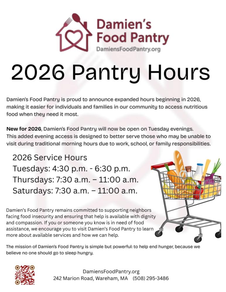 Damien's Pantry is proud to announce extended hours beginning in 2026, making it easier for individuals & families in our community to access nutritious food when they need it most. The pantry will now be open on Tuesday evenings from 4:30 to 6:30. The mission of Damien's Pantry is simple but powerful: to help end hunger, because we believe no one should go to sleep hungry.