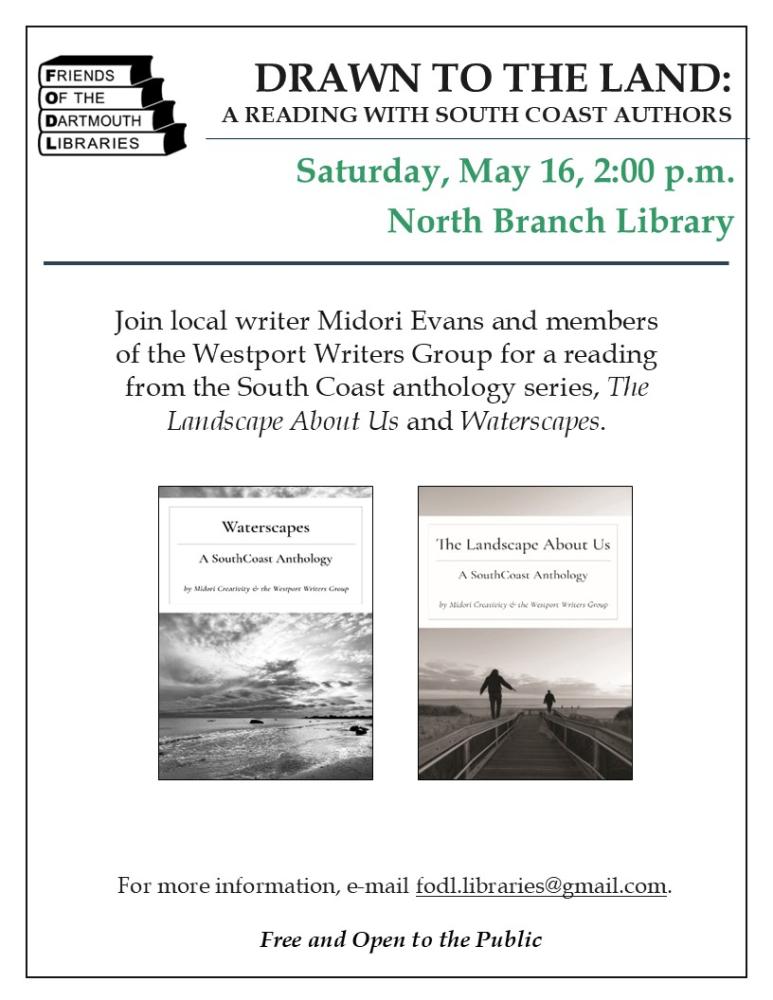 Join the Friends of the Dartmouth Libraries on Saturday, May 16, at 2:00 p.m. at the Dartmouth North Branch Library to hear authors read selections from the SouthCoast anthology series, The Landscape About Us and Waterscapes. Part of ArtWeek SouthCoast, a region-wide celebration of art, culture, and community, the reading presents emotionally resonant works deeply connected to the natural world of the South Coast. The presentation will be held at Dartmouth North Branch Library.
