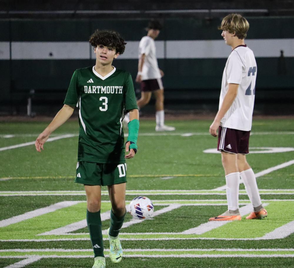 Lucas Martinez clears the ball away.With a “fairly young team” and a “tough schedule,” Dartmouth High School’s boys soccer team has battled to a fairly even record of five wins and six losses.