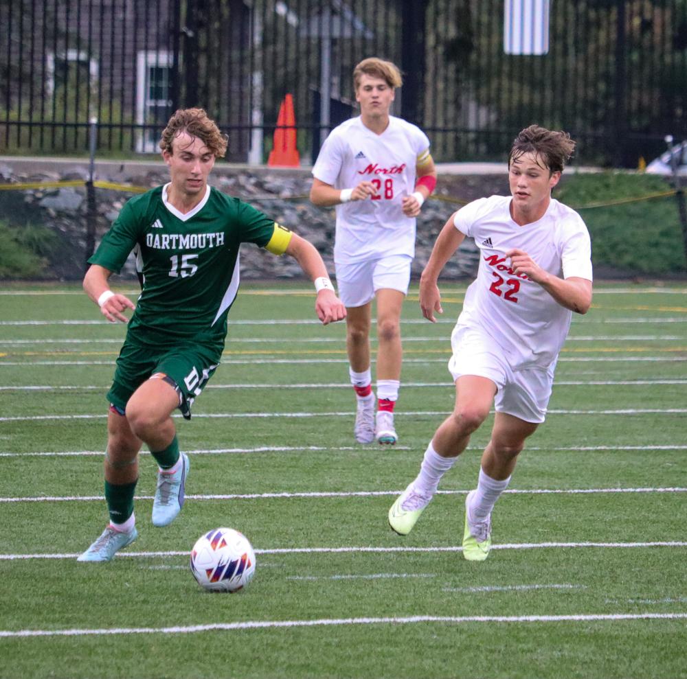 Andrew Catulo dribbles down the field in Dartmouth’s second game against Bishop Stang.