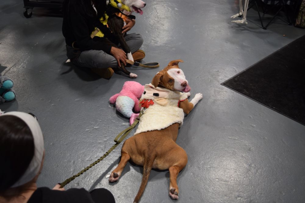 The adoptable dogs were also dressed up for Halloween. Two pitbull sisters, Panda and Passion, were dressed as a bumblebee and a sheep. Atlas, a husky, was dressed as a taco.