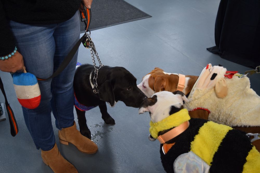 A few shop members brought their dogs to compete in a costume contest. Sam Martin, who works at the store, brought his dog Luci dressed as Wednesday Addams. April Lanard, whose father works at the shop, brought her dog Buzzy dressed as “Mr. America.”
