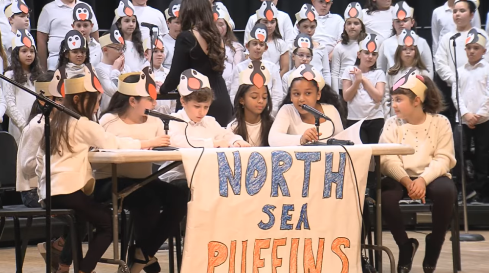 Quinn School students performed on Tuesday, Jan. 13. The fourth graders performed the play “Penelope the Pink Nosed Puffin.” In this, it's the final round of the Beak Bowl playoffs between the North Sea Puffins and the South Sea Penguins. However, all of the puffins have orange noses except for one.