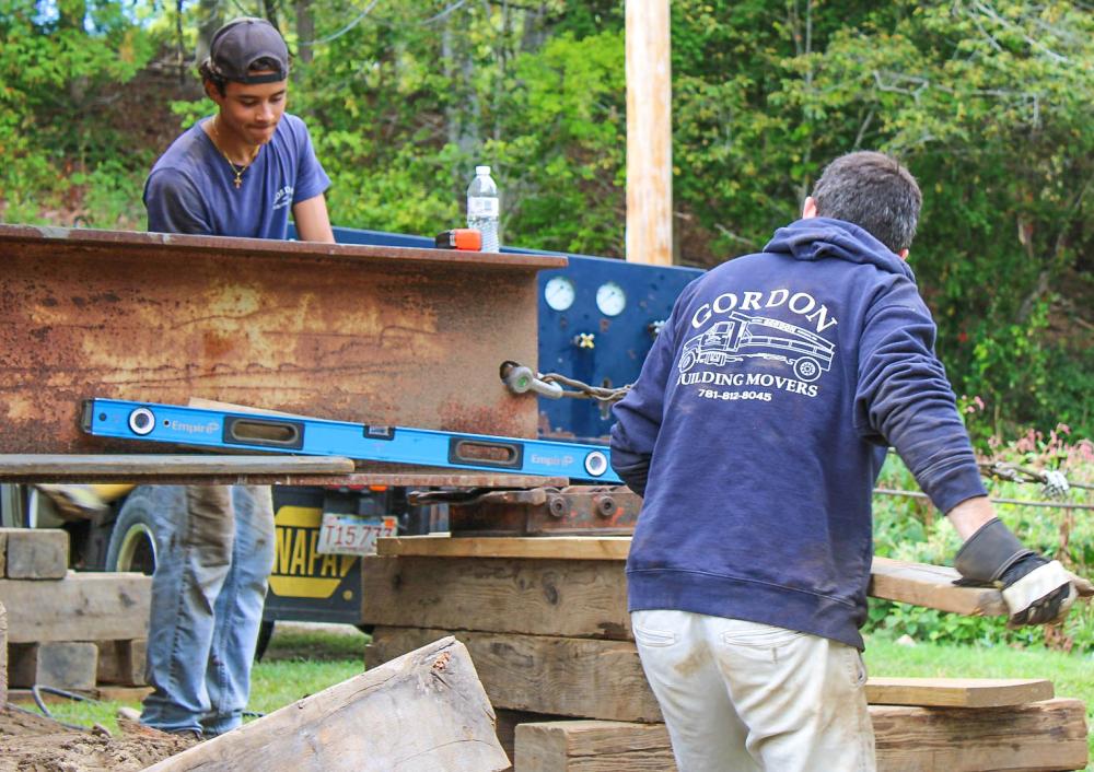 Bruno DeSouza and Jack Gordon place wood beneath a 230-year-old house they were moving in September. Photo by Abby Van Selous