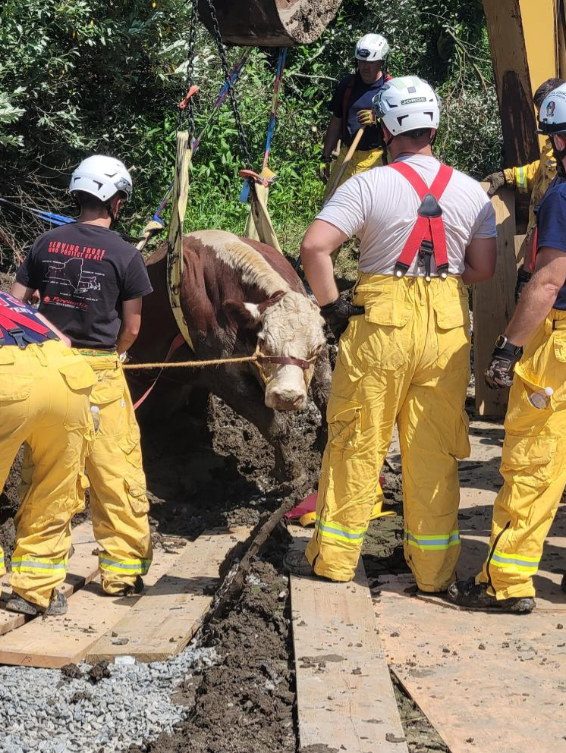 A rescue team worked to free Tallulah, the Here Forever Farm rescue cow, from the mud on Tuesday, Aug. 12. Source: Here Forever Farm