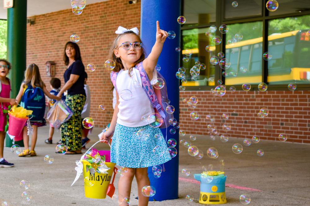 An elementary schooler reaches out for some bubbles on the last day of school. Photo by Leighah Beausoleil