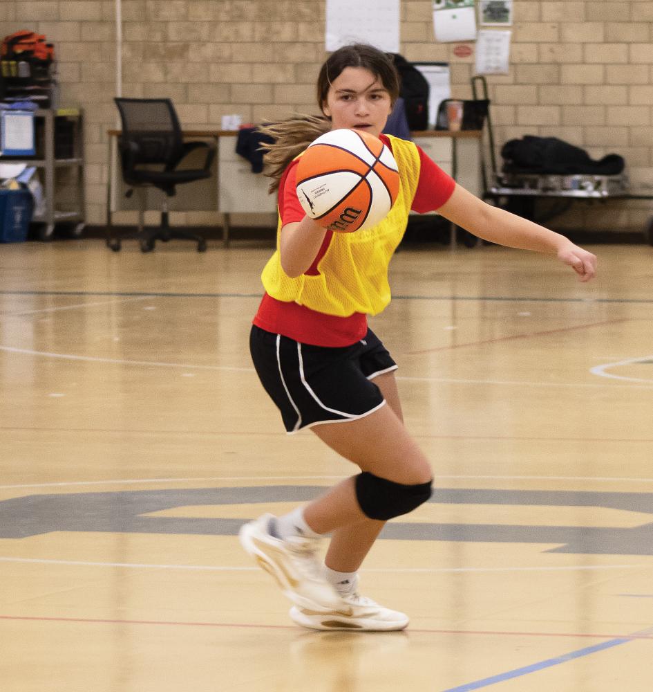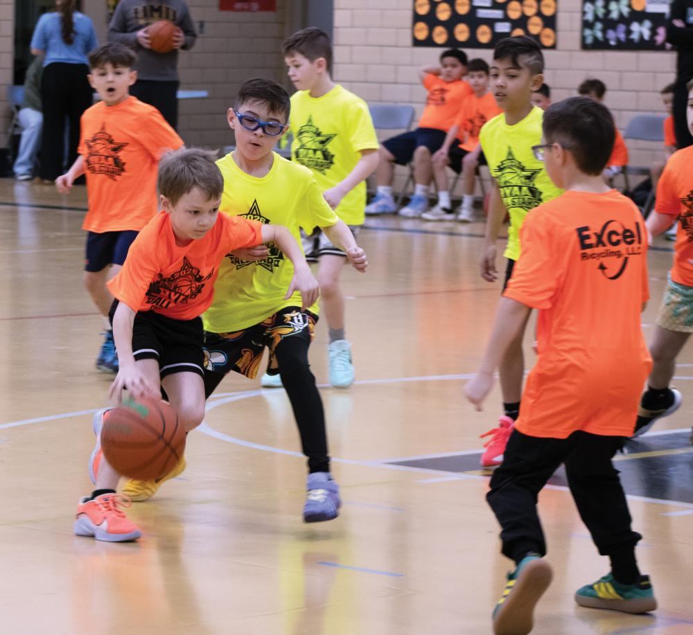 Hailey DeMello with the ball in a basketball match between teams with second and third graders.