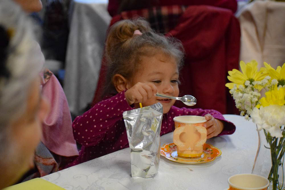 Camila Sovik, age 6, stirs some sugar into her tea. Photos by Kat Sheridan