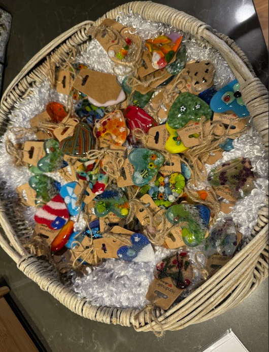 Some ornaments hanging in her studio. When Dartmouth local Jackie Hopp makes her pieces of glass art, she starts with a circle of clear glass. She then chooses a pattern, picking out the colors and cutting out the shapes.