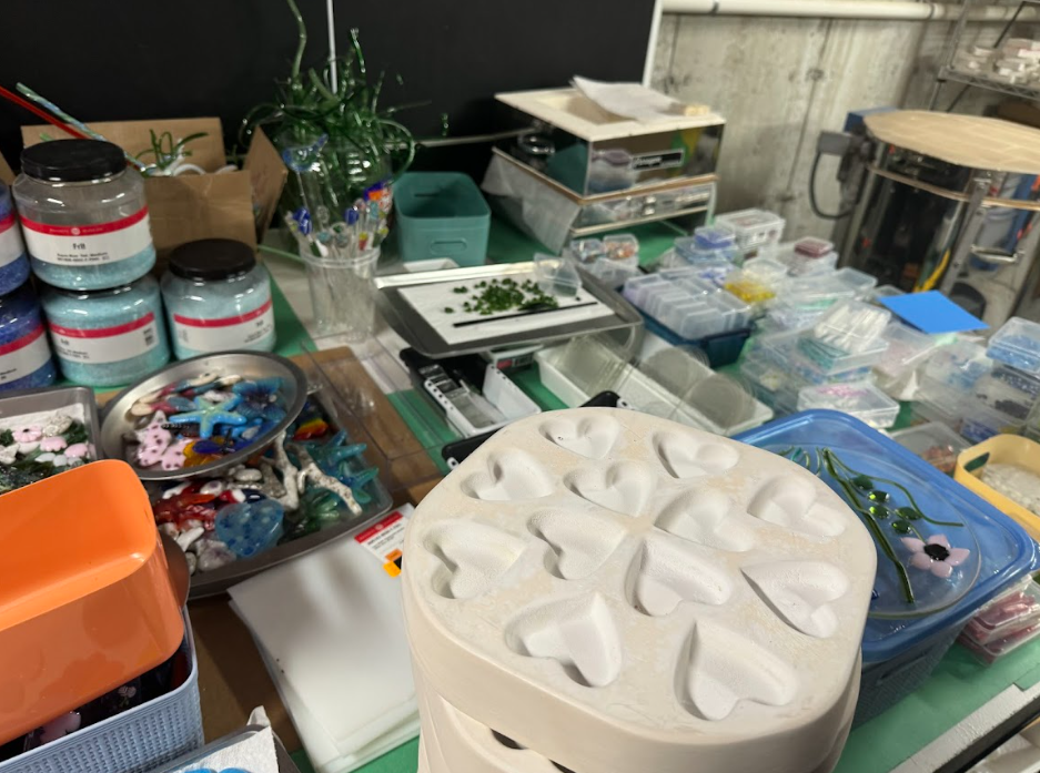 For pieces like pocket hearts and bowls, she has molds that she puts the glass on, and allows the molds to shape the melting glass.