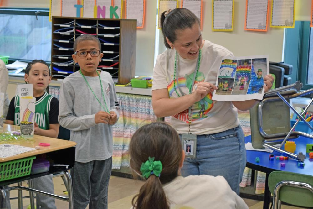 Students in both classrooms made leprechaun traps to try and catch the legendary creature. In Travassos’ class, each student made their own and then worked together to make one big trap. Gideon had her students either work in groups or on their own. Their traps were made of boxes, tape, paint and recyclable materials.