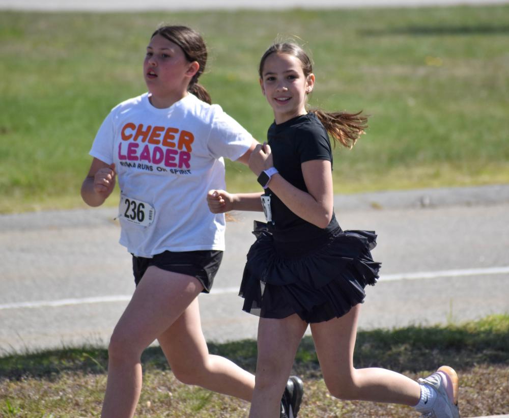Gabby Morency, 11, and Abigail Mandeville, 11, who earned second and third, respectively, in their age group, started their race of strong.