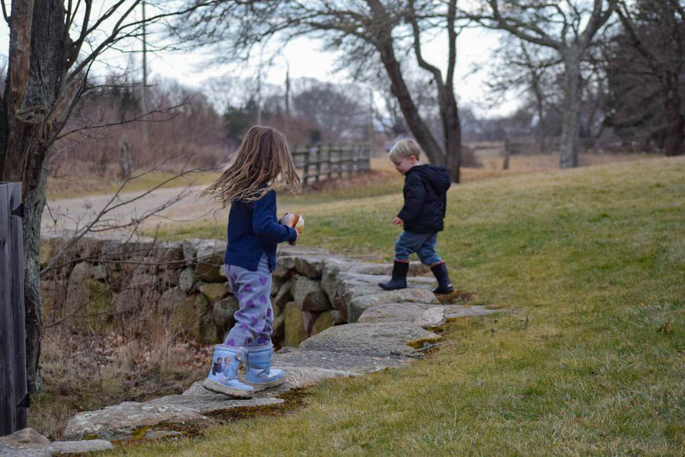 Two children run along the stone fence at Round the Bend Farm. Photos by Kat Sheridan