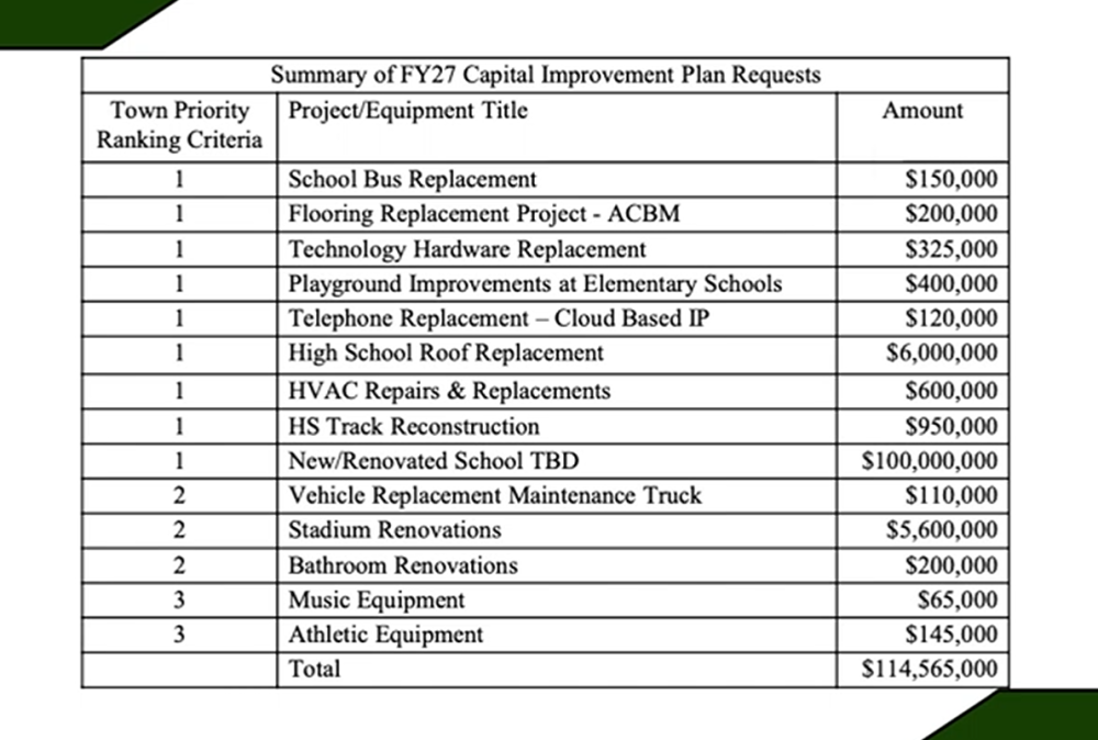 Year two of the Dartmouth School Committee’s 10-year improvement plan will include 14 capital improvement requests that comes out to a total of $114,565,000.