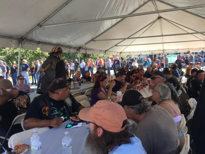 A live band played rock tunes as Harleys and other bikes rolled in from the ride, many waving American flags from wing mirrors and radio antennas.