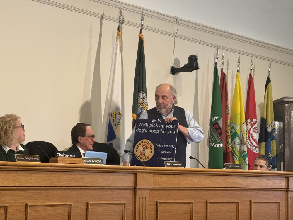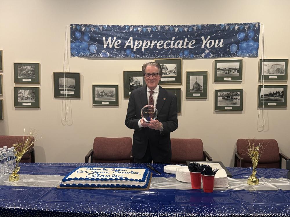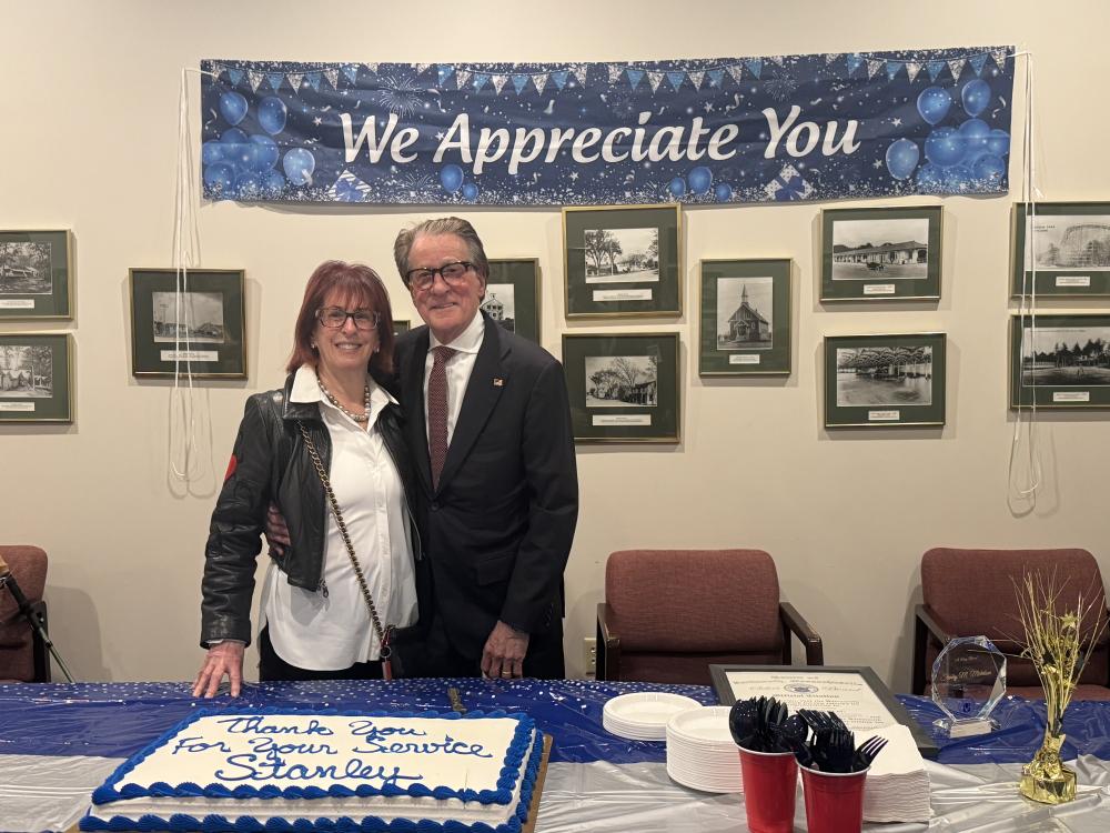 Stanley didn’t just receive kind words but also a citation for his work for the town, a glass trophy and a sign that Tatelbaum took off a street pole— where it was illegally hung. He gifted the sign, which was for a dog poop removal service, to Mickelson as a parting gift. They ended the celebration with cake.