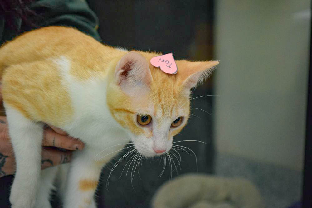One of the bonded kittens gets a heart placed on her head.