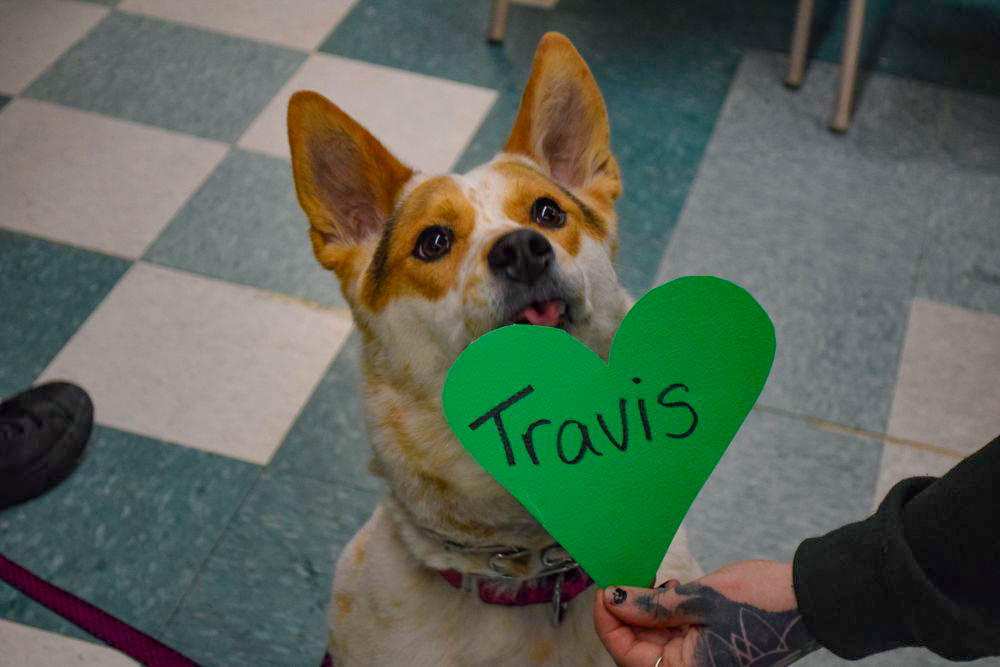 Cookie Dough paws at a heart outside her kennel.