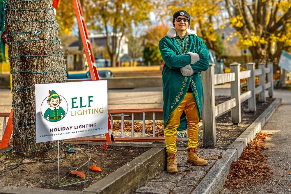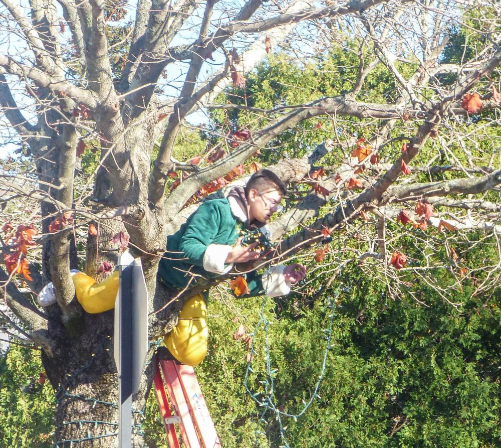 An elf climbs a tree to hang lights. Source: Audra Lynn