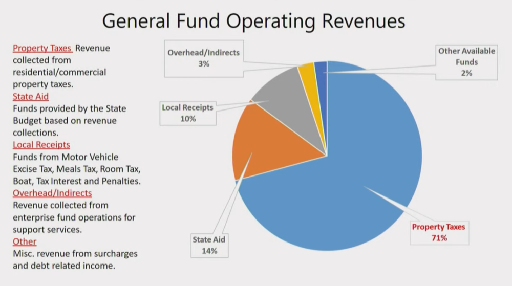 There are five primary ways the town gets revenue: property taxes, state aid, local receipts, overhead and indirect costs, and other funds that may be available.