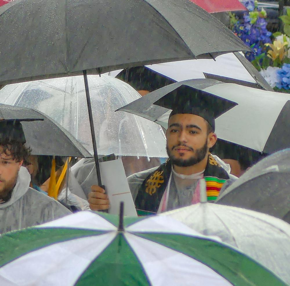 As the rain came down on Thursday morning, May, 16, UMass Dartmouth’s graduating Class of 2024 huddled together under a sea of umbrellas awaiting the start of their commencement ceremony.