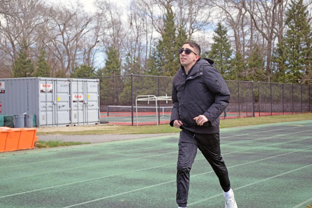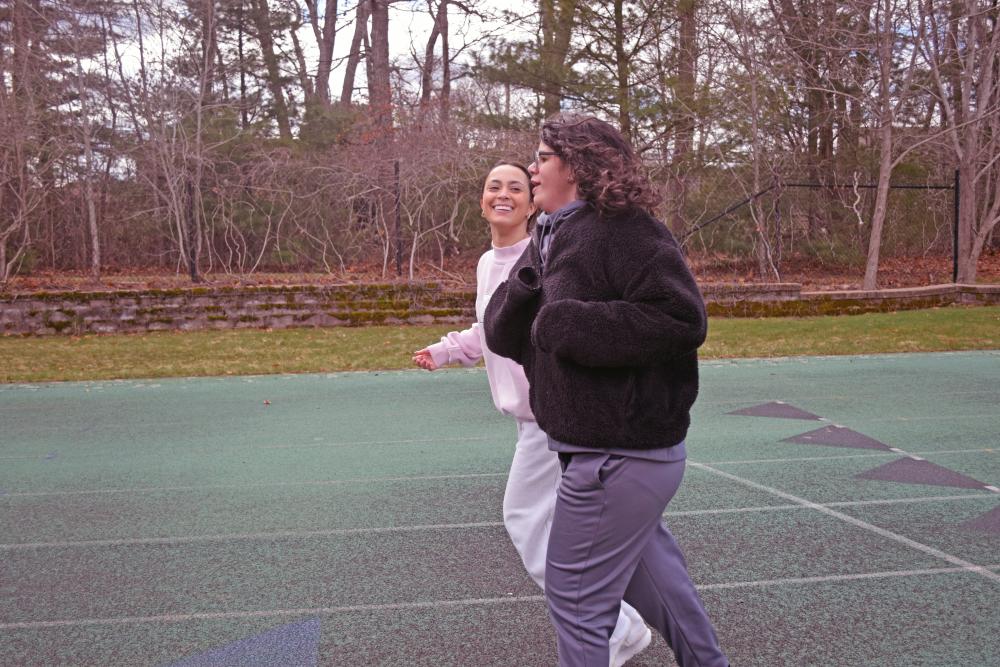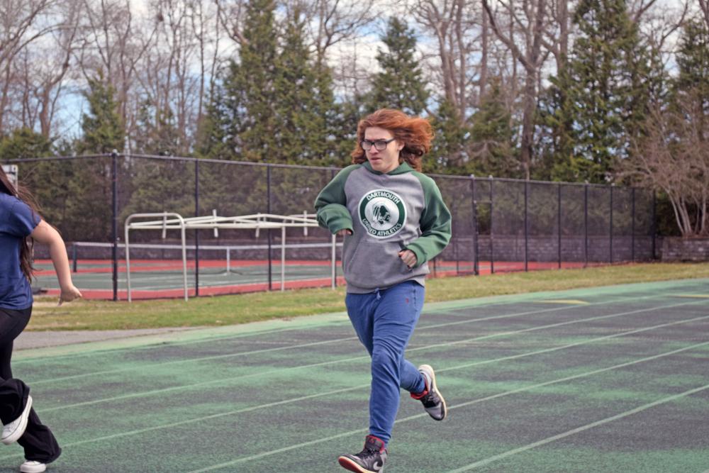 Selena Pacheco and Joe Adao finish their run. Athletes and partners from the Dartmouth Unified track and field team sprinted around Dartmouth High School, both trying hard but joking around together as they prepared for the season ahead.