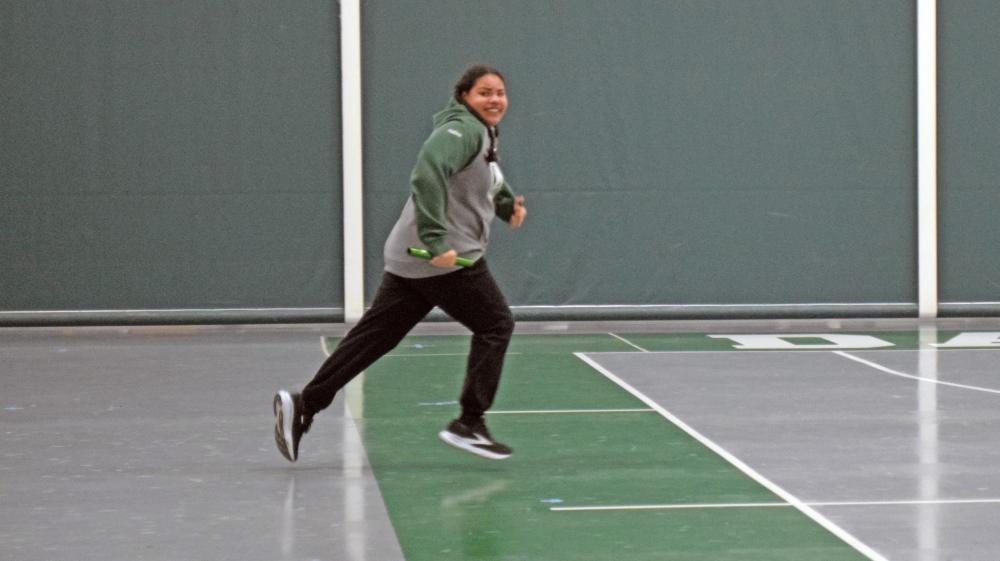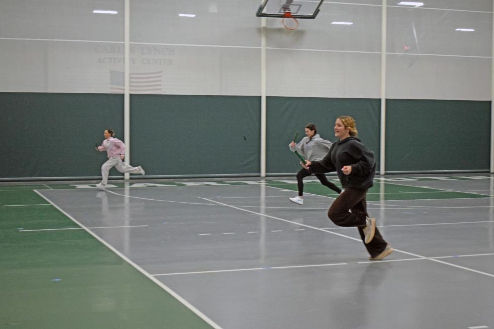 Seniors Kaelyn Zuber, Chace Levasseur, and Emma Garcia lead their teams in the relay race.