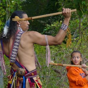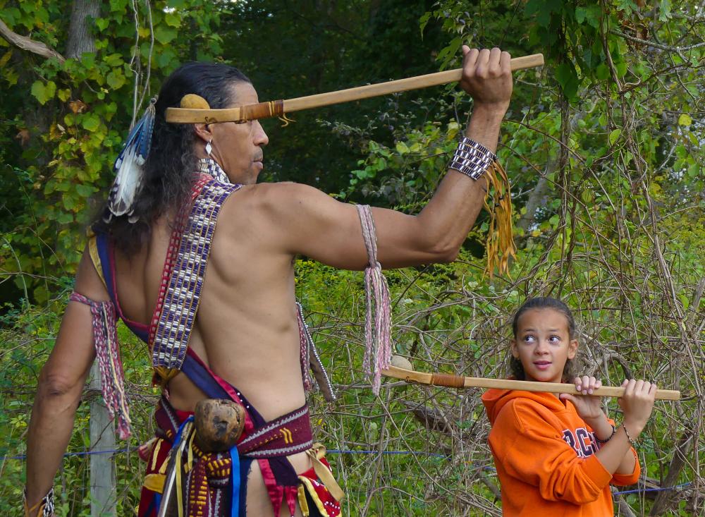 Annawon Weeden shows Xylah Cauley, 12, how to play a traditional game. Photos by Abby Van Selous
