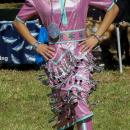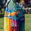 One of the fancy shawl dancers prepares to dance in a demonstration that imitates how butterflies fly through flowers.