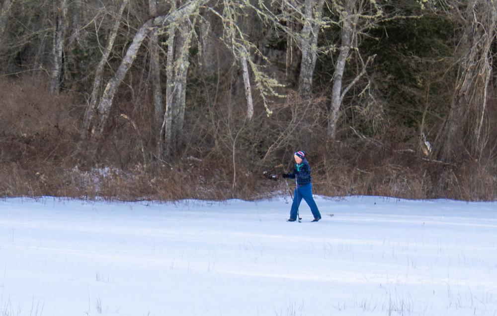 A cross country skier skies in a field near the entrance to the Destruction Brook Woods trails on Sunday, Feb. 1. Photos by Abby Van Selous